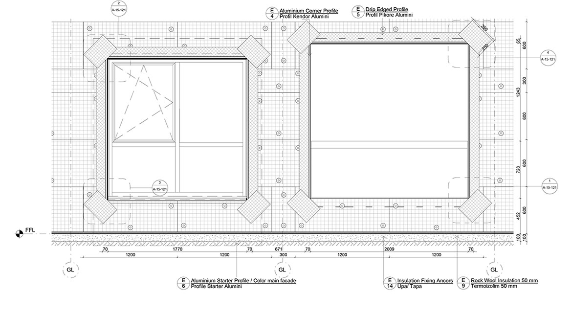 Termoizolimi i fasadës realizohet me lesh guri me trashësi 70 mm të vendosur mbi muraturën 400 mm. Leshi i gurit është rezistent kundrejt agjentëve atmosferikë, zjarrit, ndotjes akustike dhe ndotjes së ajrit. Struktura poroze dhe e hapur, e përbërë nga fibra rezistente deri në temperaturë 1000° c, krijon një barrierë termike dhe akustike. Ky sistem siguron reduktim të konsumit të energjisë deri në 60% dhe siguri më të madhe teknike